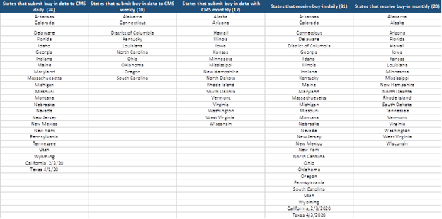 daily state-CMS data exchange to identify Medicare enrollees as well as which party – Medicare or Medicaid – is liable for paying each beneficiary’s Parts A and B premiums (commonly referred to as “buy-in” files). The table below lists the current frequency